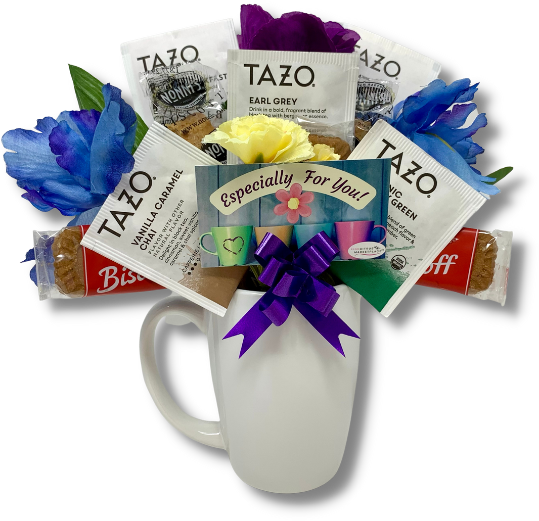 Arrived quickly, everything just as described! Great gift for people who enjoy tea. Really good quality cup, nice selection of Tazo tea bags, honey sticks & a package of biscuits that go perfectly with tea, all packaged very well and arrived in excellent condition. Would definitely buy from again.